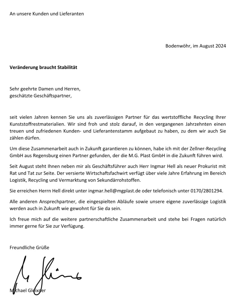 Seit 1985 bieten wir unseren industriellen Vorlieferanten einen sicheren Verwertungsweg für Angüsse, Über- und Ausschussproduktionen in bestmögliches, qualifiziertes und wertstoffliches Recycling. Vormals als „Firma Michael Gleixner und Sohn Kunststoffrecycling“ gegründet und 1996 in die „MG-Plast GmbH“ umfirmiert, bearbeitet das Unternehmen fast ausschließlich Produktionsabfälle aus der kunststoffverarbeitenden Industrie.
